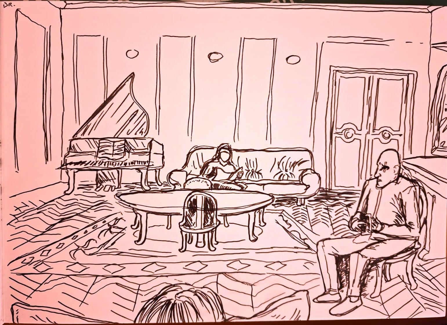 Dans ce dessin réalisé rapidement, on peut déceler en bas à gauche la famille de l'auteur du dessin, en haut à gauche une zone trés éclairée, en haut à droite, un ciel obscurcissant, et en bas à droite, une maison dont la porte d'entrée se confond dans le tournoiement aux autres fenêtres. Il y a un aspect centripète dans la maison, lorsqu'au contraire, l'environnement extérieur est centrifuge par ces traits « en roseaux ». il y a beaucoup de vent;