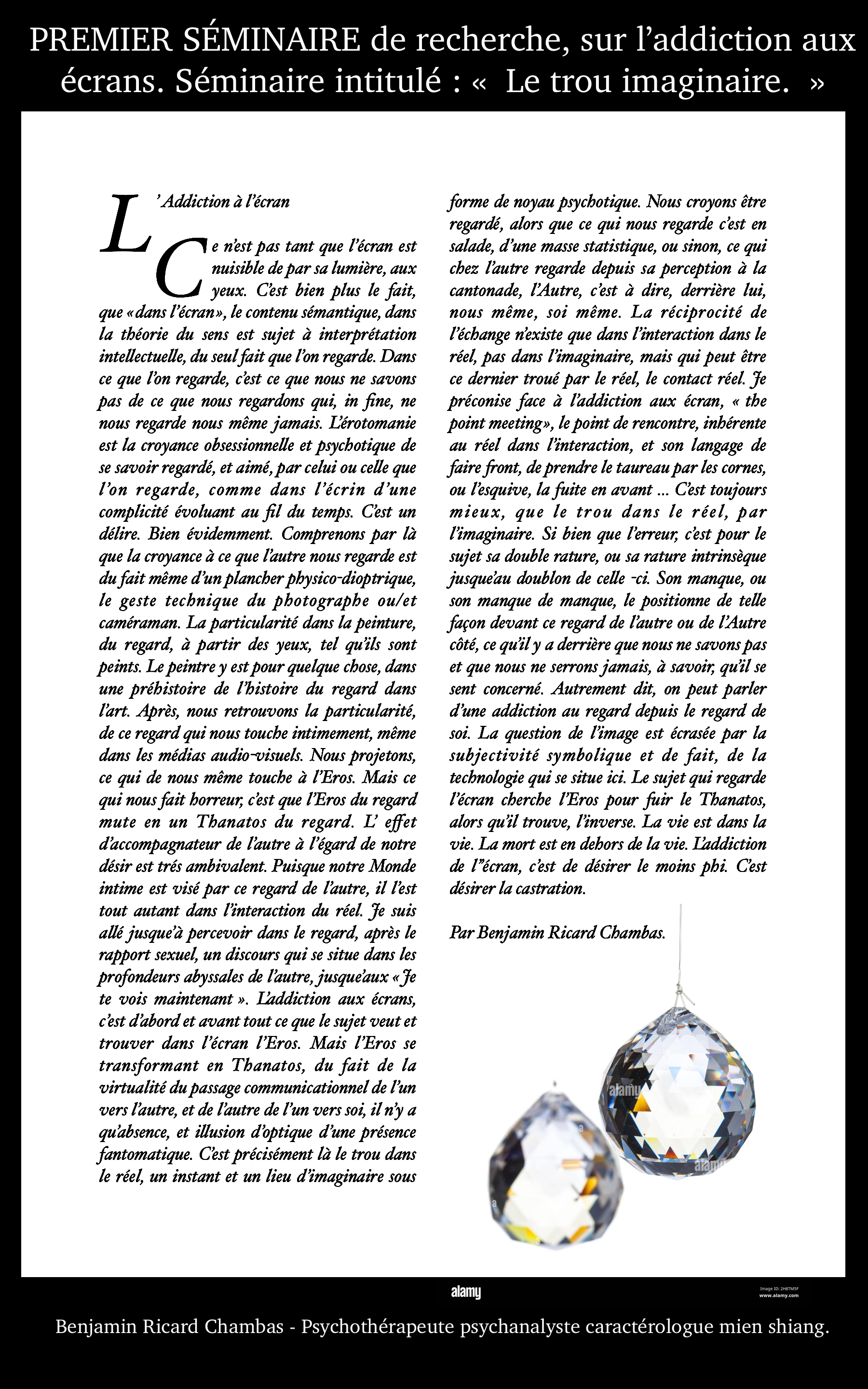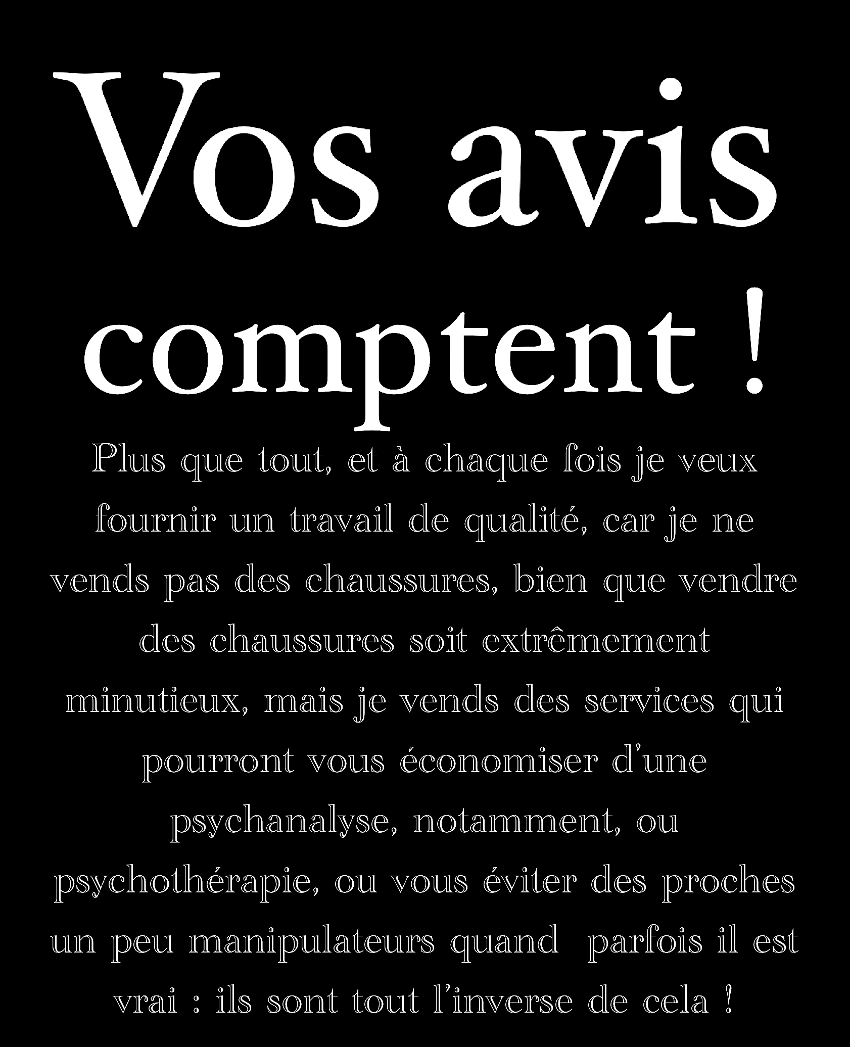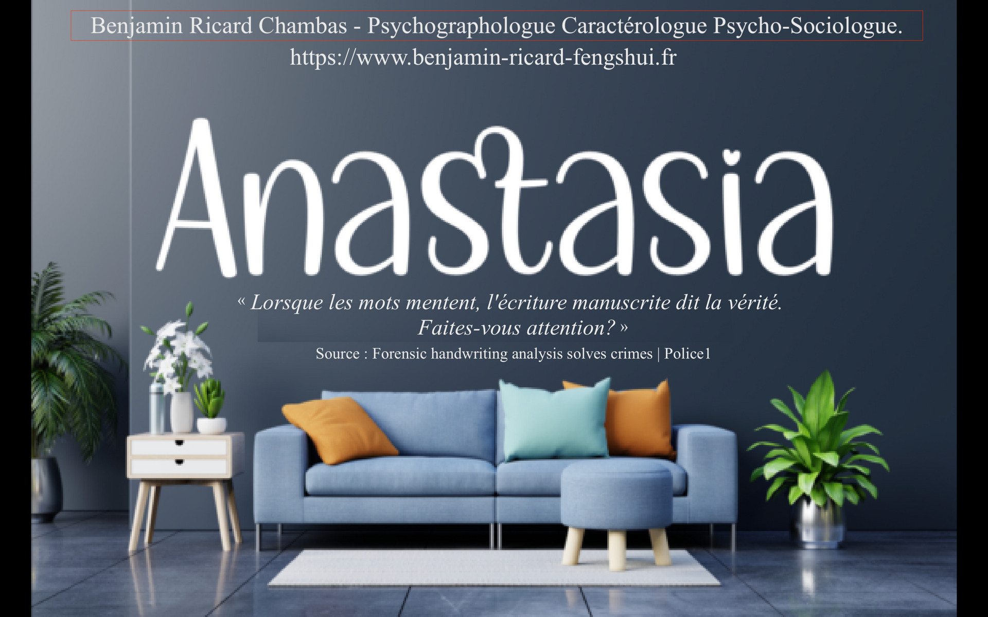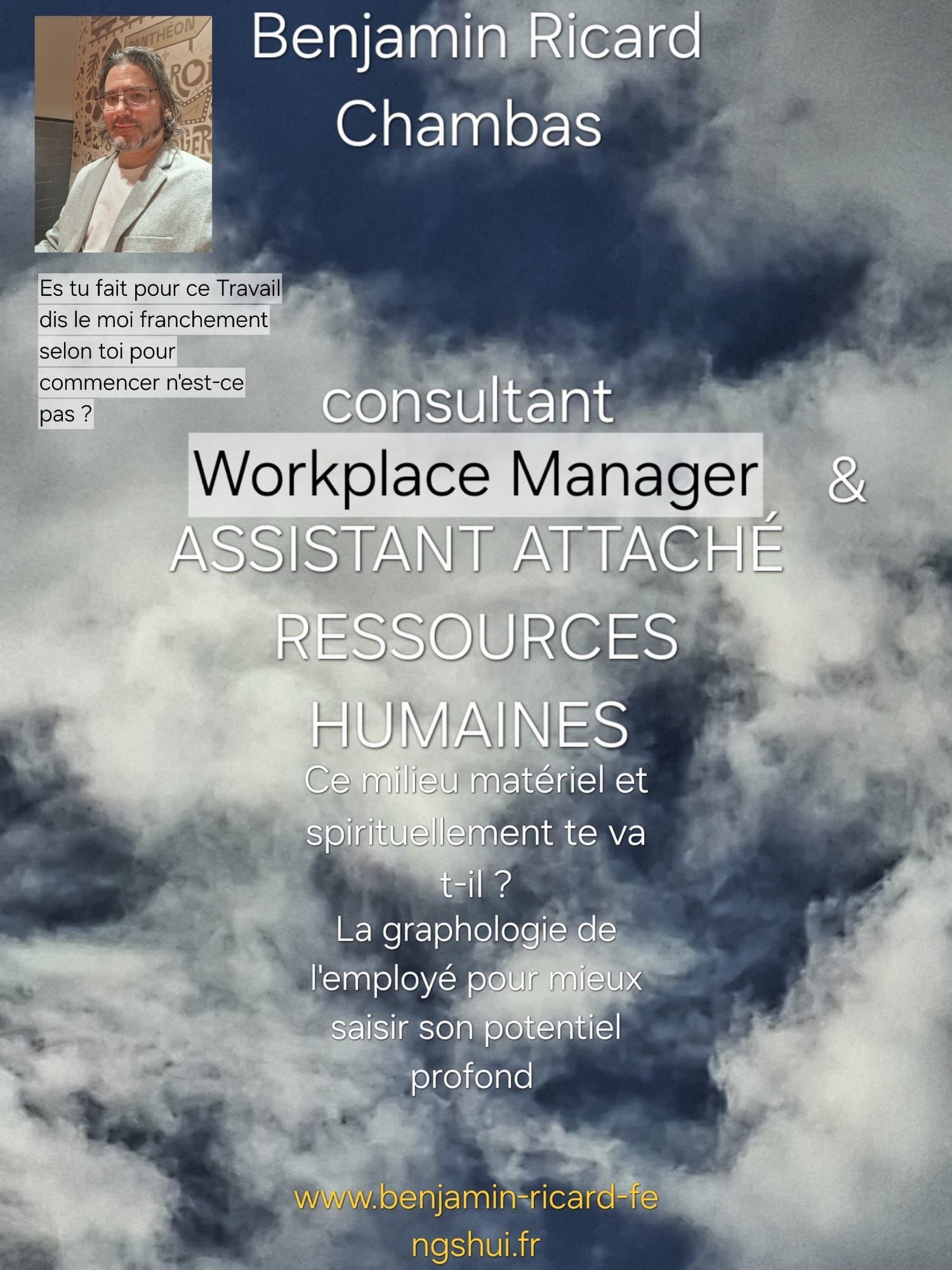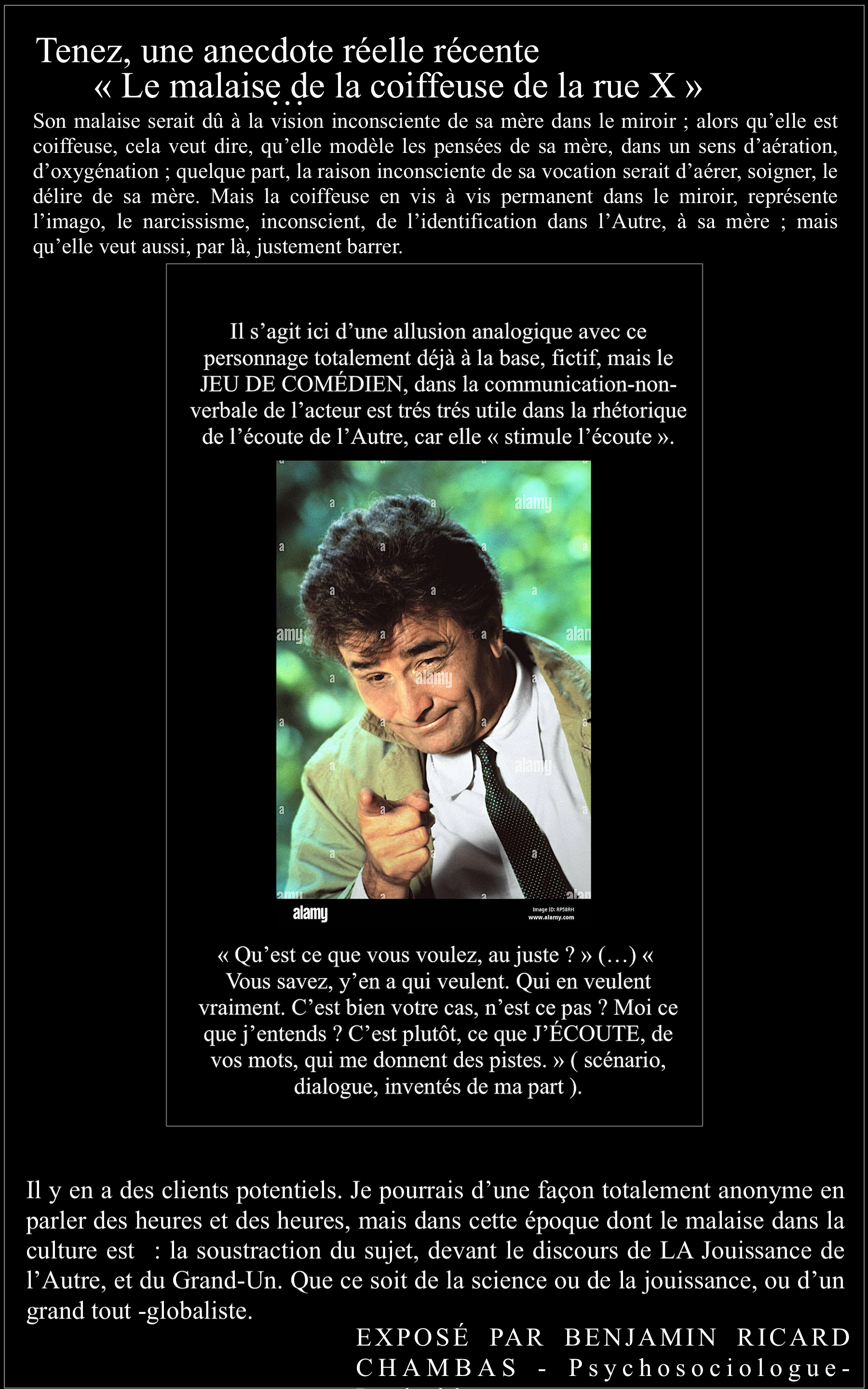 Je préciserai toujours que mon activité principale professionnelle est la graphologie, tout comme il se doit dans ce métier d'envisager de corréler l'analyse graphologique par un environnement de compétences professionnelles elles aussi, tournées quoi qu'il en soit vers l'humain et son noyau subjectif dont la part qu'il constitue se projette dans une réalité sociale. D'autre part, plus la société est tournée vers l'écriture numérique non manuscrite plus la valeur de la préciosité et de la rareté du trait graphique du sujet en sera augmentée. Au point que, d'un point de vue global, l'humain ne peut se soustraire de l'humain puisqu'un Homme - augmenté, ou un trans-humanisme, par le biais du comportementalisme computationnel ( Thérapies comportementales cognitives ) ne peut être qu'un fantasme politique. Par ailleurs, la graphologie ( HANDWRITTING ANALYST ) est sollicitée bien plus encore depuis longtemps dans le monde anglo-saxon, dans le cas d'investigations. Mais il ne s'agira que de proposer un type de profilage formulé avec prudence. De nos jours en France, alors que cette discipline du trait scriptural est Made In France si je puis dire, elle s'est restreinte à l'enceinte des DRH, isolée de sa toute splendeur. Elle est aujourd'hui conjuguée à d'autres compétences, comme Le Coaching de plus en plus démocratisé. On ne peut dans ces approches se soustraire d'une analyse personnelle. Je suis PSYCHANALYSTE, depuis 2010. Diplômé également d'un cursus en sociologie, jusqu'à l'EHESS en sciences sociales mention épistémologie des sciences. J'étudie la communication Prise de Parole en public.