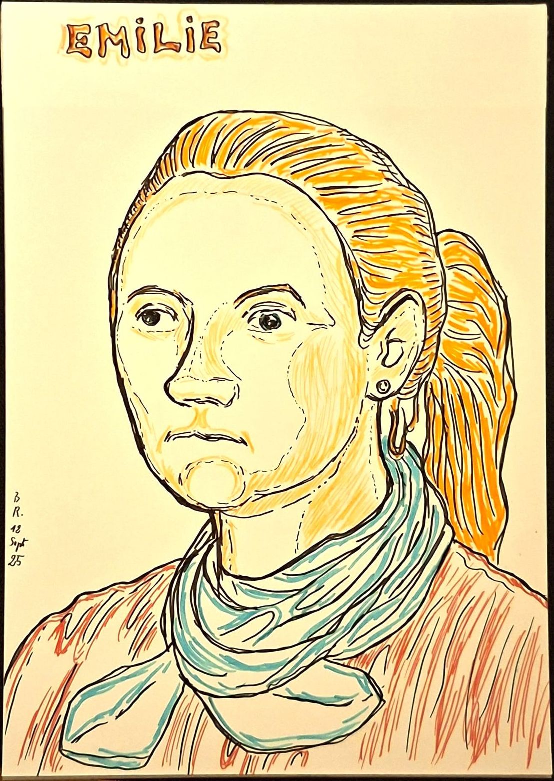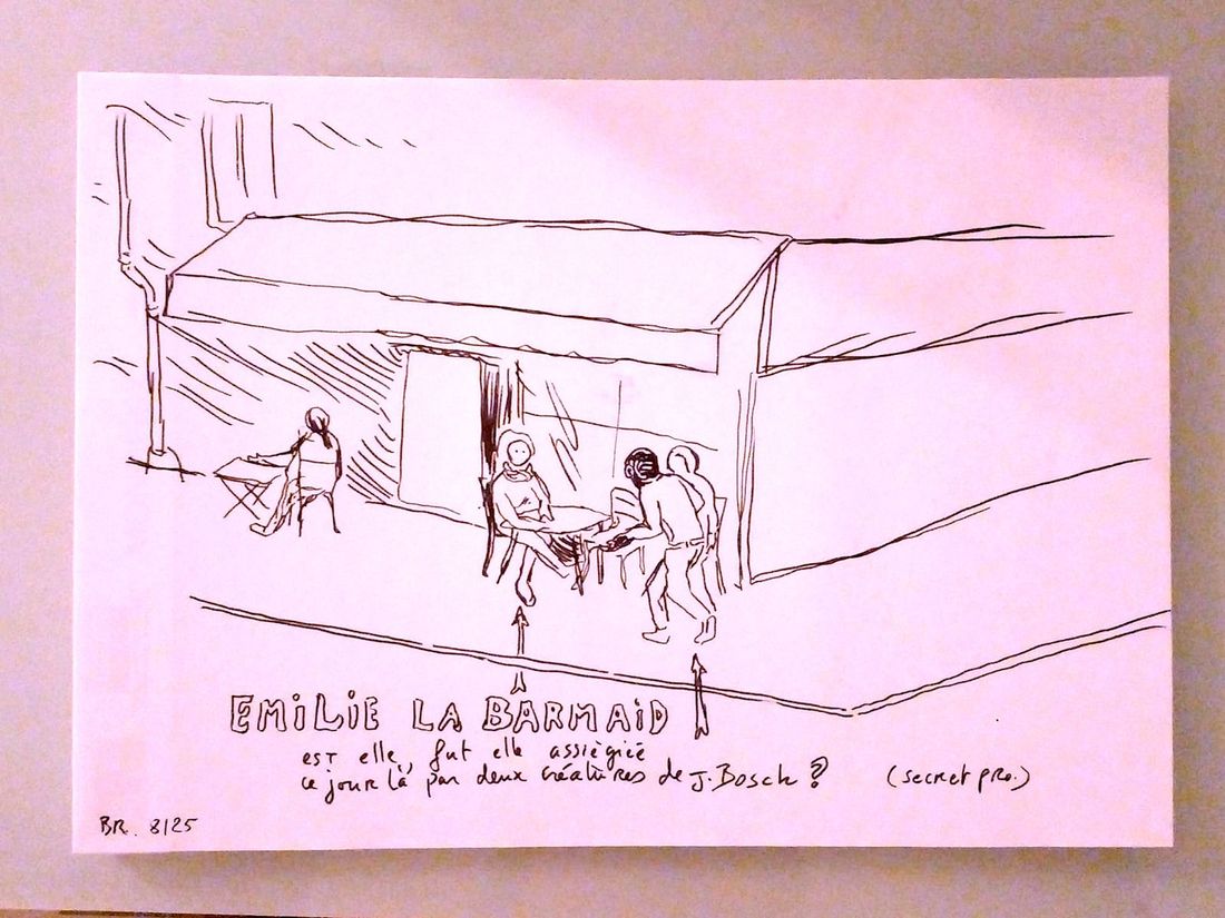 Emilie, je l'ai dessiné ici de mémoire, je ne connais que son prénom et ce qu'elle a fait un peu avant, du stylisme dans les vêtement, qu'elle est née en 1985, probablement. Elle s'est volatilisé comme un oiseau. Celle qui la remplace Sarah a quelque chose d'elle. C'est marrant. Maintenant, je me demande :