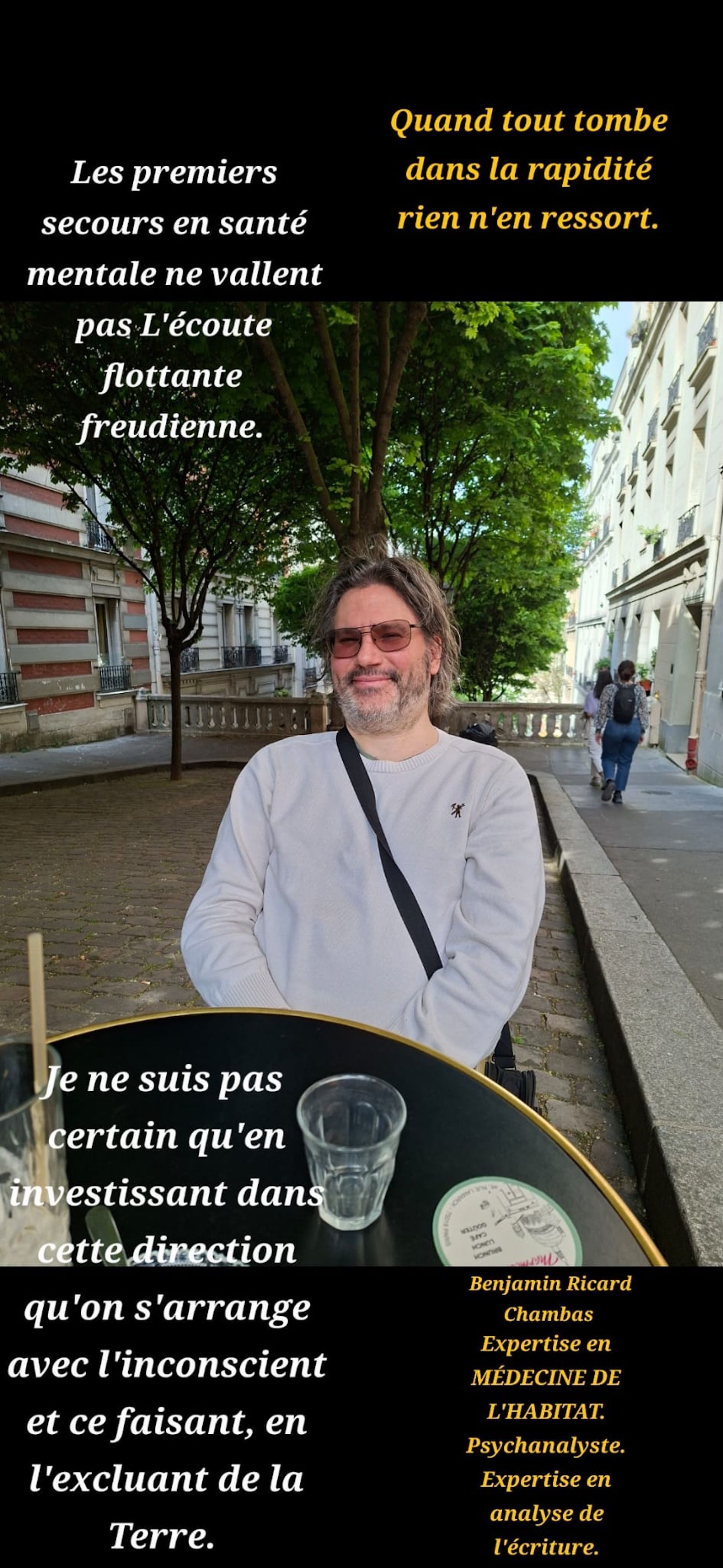AFIN DE VENIR VERS VOUS, VERS UN "COMMENT ÇA VA ?" je pose un interêt pour l'Autre, dans sa complexité, ses paradoxes, ses tourments, ses tourbillons intérieurs, ou ses zones d'accalmies de pensées, de tranquillité d'esprit. Mais CHEZ TOI, CELA tourne aussi bien dans le positif que dans le négatif, QUAND LA FATIGUE MONTE. FAIRE ACTE DE PRÉSENCE est un effort pour moi, car je dois SAVOIR COMMENT LE FAIRE. Je sens les choses comme un chien d'une certaine odorat. Intuitif et hyper sensible, rien ne m'échappe. Je suis Hyper entrainé à l'observation des détails infimes en communication non verbale graphologique et morphologie-psychologique comme celle que les lieux expriment, de par leurs structures ( feng shui de l'école des formes) : dans le seul but de COMPRENDRE ET NE PAS JUGER.