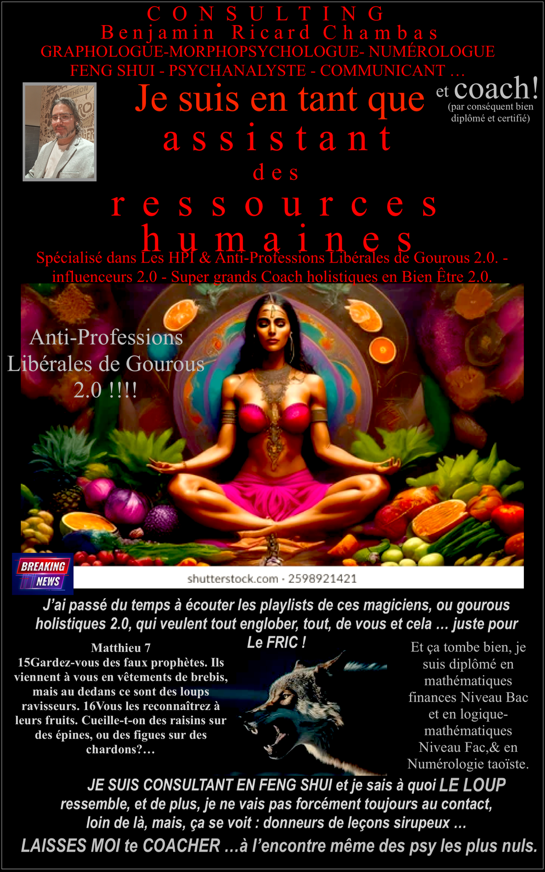 Ces professionnels, soit disant : en libéral, amassent une telle quantité de prestations, parfois sur de trés solides bases, qu'ils en deviennent addictifs, et perdent en quelque sorte un certain contact à la réalité passant peut être parfois pour des "margoulins de service", alors qu'ils se mettent au service des autres, et que cela devient au service de l'Autre, avec un A - Majuscule, c'est à dire, qu'ils deviennent esclave d'un tout - holistique, d'une globalité, d'une omniscience laborieuse, et qui ne peuvent s'arrêter ... faisant d'eux même, des "montgolfières", perchés dans les hautes sphères tout comme les sphères "du tout ressentie énergétique", se gavant de mots creux et valises, "énergétique", "corps astrales", alignement", "lâcher-prises", "pleine conscience", "écoute", "écoute des anges", "votre ange", "enfant intérieur", "flamme violette", "les infra terrestres ou intra terrestres", baratins "de la redondance", et ton soporifique! Mais certains peuvent devenir de petits Léviathan, en série, sur la toile ! Après la "quatophrénie" de la "sociologie clinique ( Jussieu )", je parlerais d'un accroissement de prestations dans une même expertise, au point de ramifications, sans fin ... là où le praticien devient multi dimensionnel dans une réalité socio-économique pourtant pour eux même, bien parfois, poreuse et crénelée, contraignante, et restreignante. C'est cette autolatrie, qu'ils comprennent dont ils sont eux mêmes prisonniers. Tarif : POUR TOUS PROFESSIONNELS HOLISTIQUE, je propose "une mise à distance de soi" par une enquête tournée sur le chemin du désir du sujet", d'une approche psychanalytique bien sur !