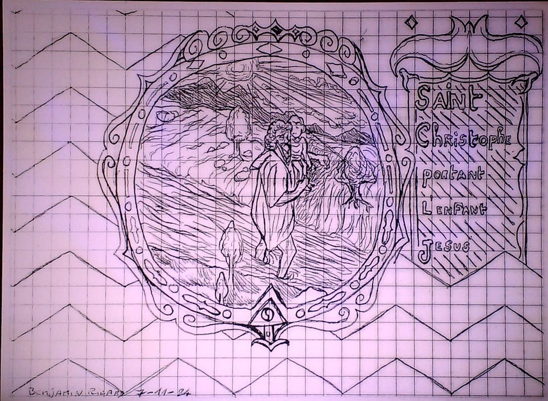 le médaillon st Christophe : DESSIN ORIGINAL 11 X 17 CM . IL S'AGIT ICI D'UNE PHOTOGRAPHIE D'UNE PHOTOCOPIE TRÉS AGRANDIE DE L'ORIGINAL. il aurait été impossible de photographier l'original trop petit pour la qualité d'un téléphone portable samsung.