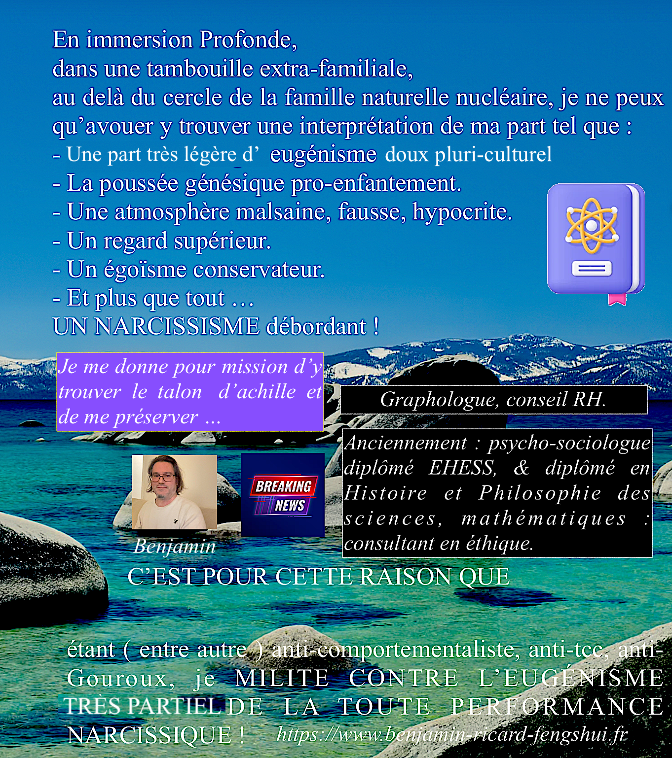 Sur ce site, je présente des contenus informatifs, en rapport plus ou moins directement à l'axe de mes compétences, autour de l'Humain, l'exploration et la détection de la personnalité, d'une façon trés sérieuse, mais aussi illustrée, humoristique, et ludique.