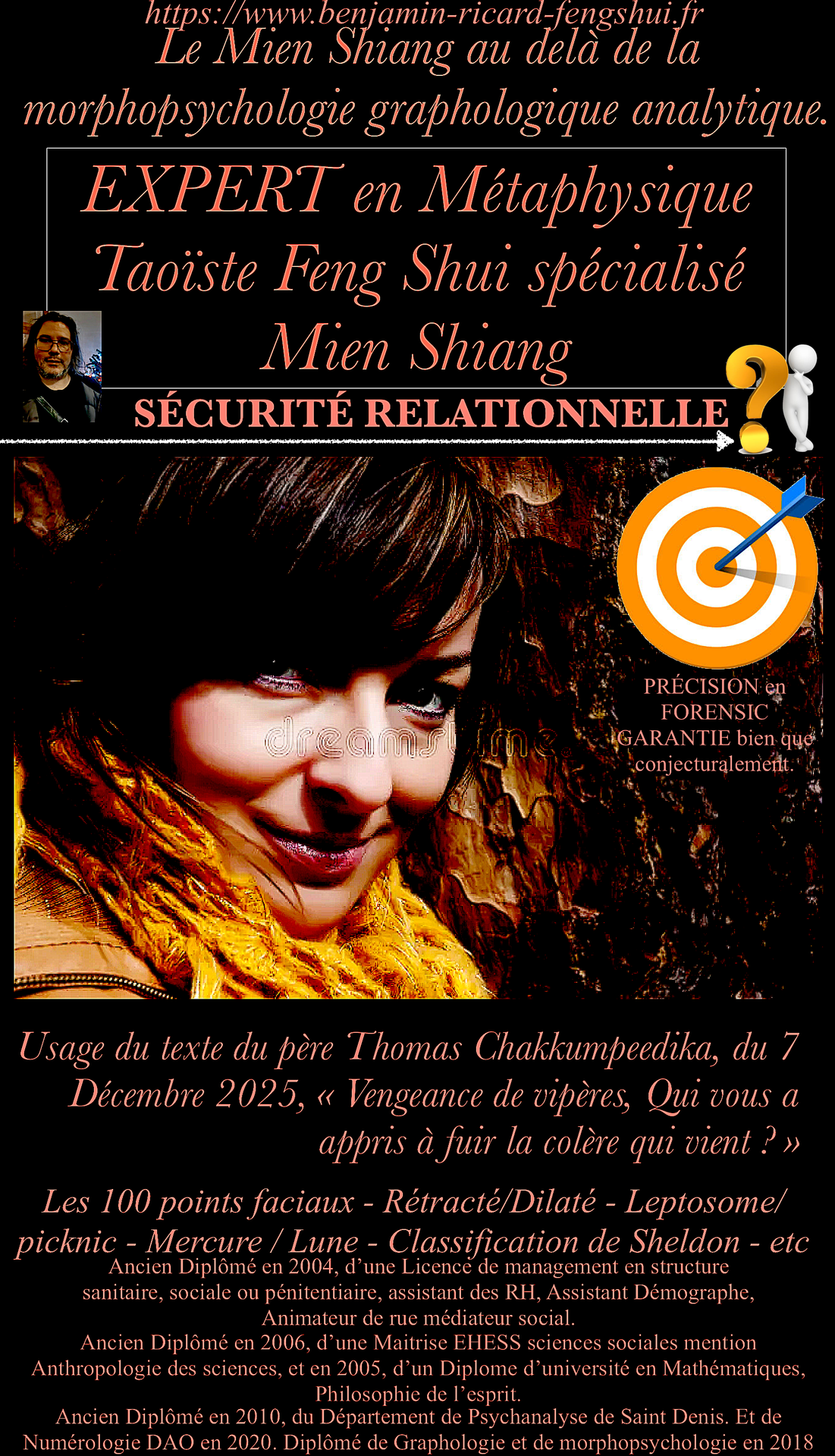 Spécialisé en Feng Shui, je possède également des compétences approfondies en graphologie, morphopsychologie, psychanalyse et une solide formation en histoire et philosophie des sciences et de l'esprit.