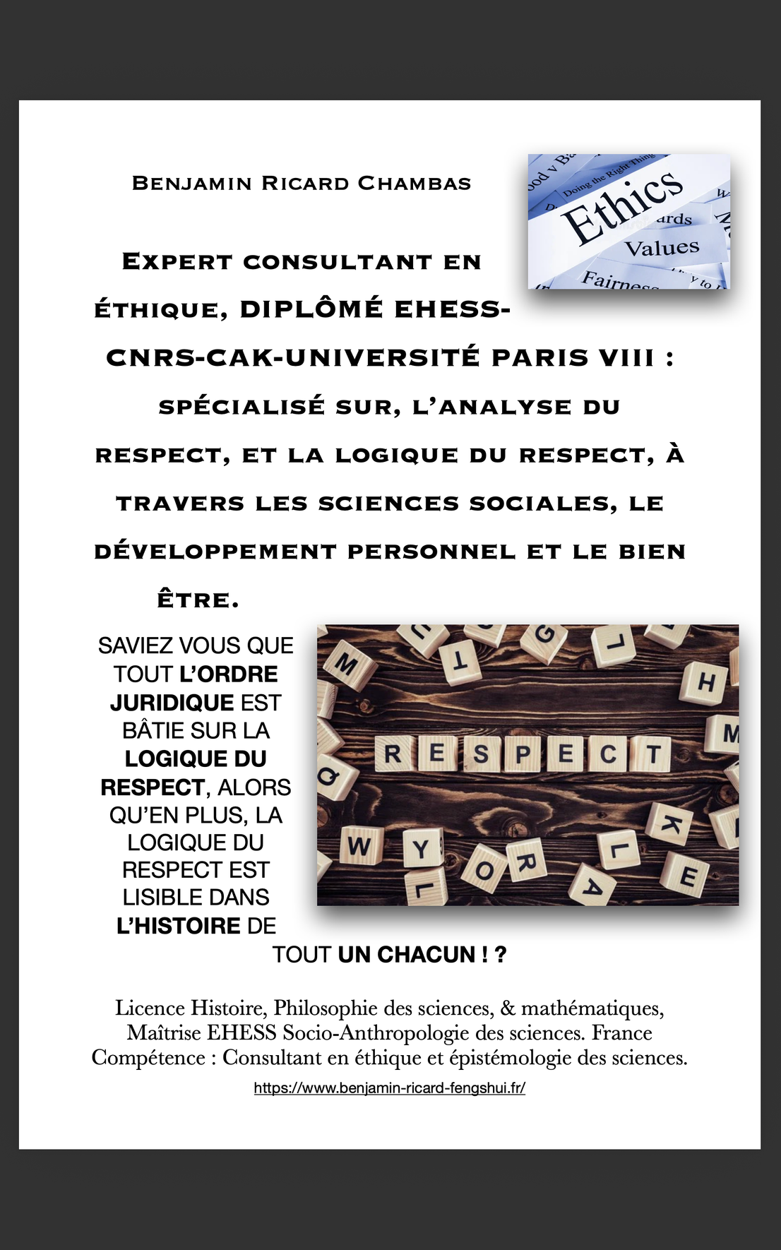 sans aller tout droit dans le sens de la promotion de quatre disciplines qui sont en ma compétences, la relation d'aide par la psychanalyse et la caractérologie, la grapho-morpho-analyse conseil, la sociologie, et le dessin de scènes ( réelles ou/et imaginaires ), je voudrais ici, vous communiquer quelques résultats de mes recherches sur internet, pour ce qui est de la déontologie, et par conséquent vous offrir comme vous pourriez le faire vous même, au vue de tous ces résultats de documents trouvés sur Internet, une vue globale ... Il s'agit de LA LOGIQUE DU RESPECT, que l'on retrouve dans le droit en général.