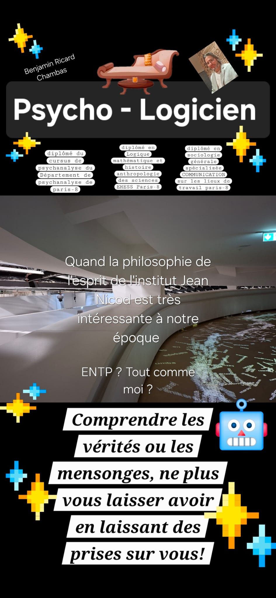 En toute transparence, mes diplômes universitaires en psychanalyse de la Licence au Master, tout comme en sociologie jusqu'à l'obtention du diplôme de l'EHESS-ENS, dans les années 2000, se voient ainsi prolongés par l'extrême densité ( qui peut ne pas en avoir l'air peut être ) de la morphologie-psycho-caractérologie et graphologie d'orientation analytique freudienne et jungienne, entre autre. J'ai voulu DIVERSIFIER LES APPORTS D'ENSEIGNEMENTS, LES POLITIQUES DES ÉCOLES, ET LES MIEUX SITUÉES, DEVANT: