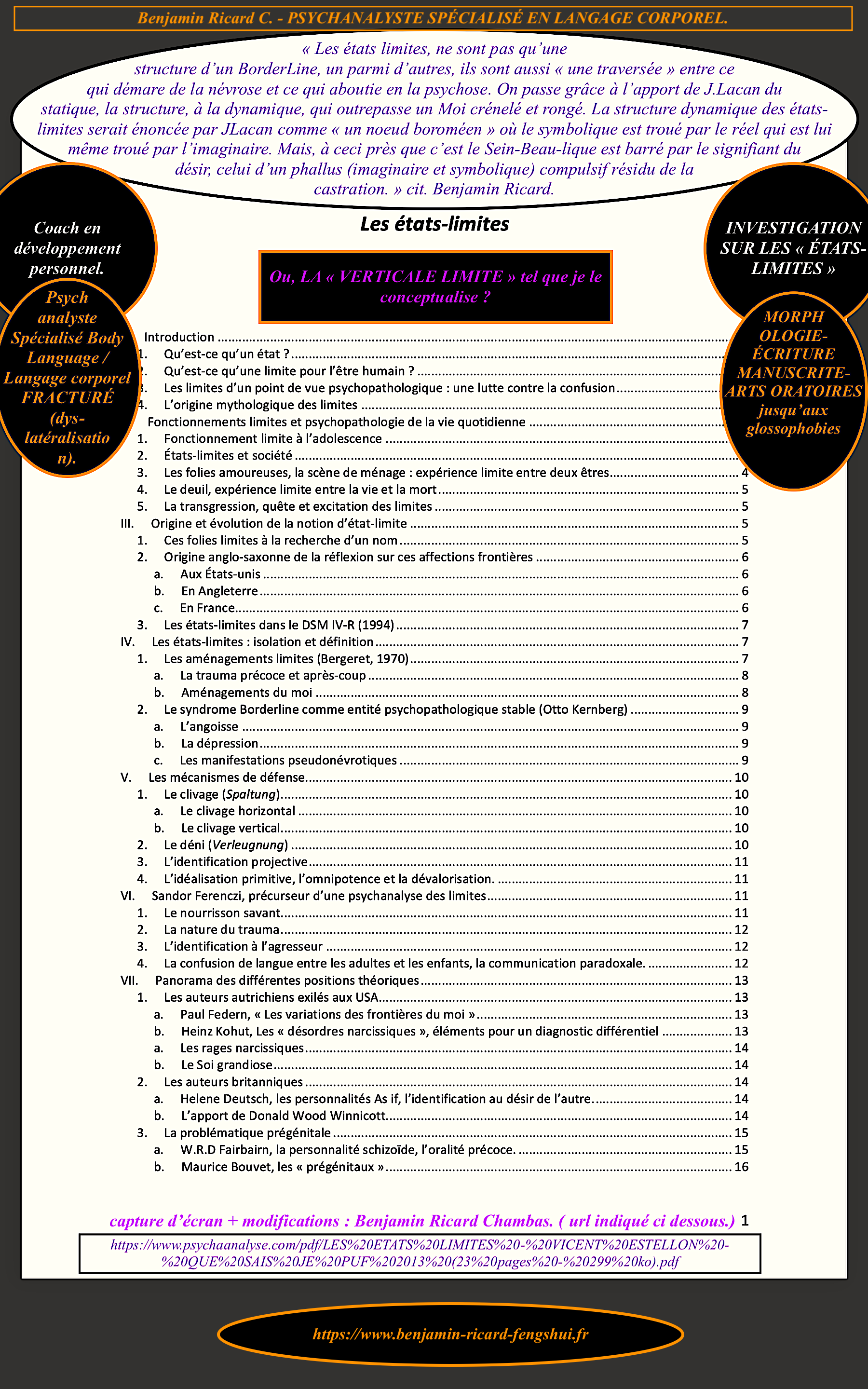 structure d'un BorderLine, un parmi d'autres, ils sont aussi « une traversée » entre ce qui démare de la névrose et ce qui aboutie en la psychose. On passe grâce à l'apport de J.Lacan du statique, la structure, à la dynamique, qui outrepasse un Moi crénelé et rongé. La structure dynamique des états-limites serait énoncée par JLacan comme « un noeud boroméen » où le symbolique est troué par le réel qui est lui même troué par l'imaginaire. Mais, à ceci près que c'est le Sein-Beau-lique qui ( erreur sur la vignette ci dessous, où le mot "qui" a été oublié ) est barré par le signifiant du désir, celui d'un phallus (imaginaire et symbolique) compulsif résidu de la castration. » cit. Benjamin Ricard.
