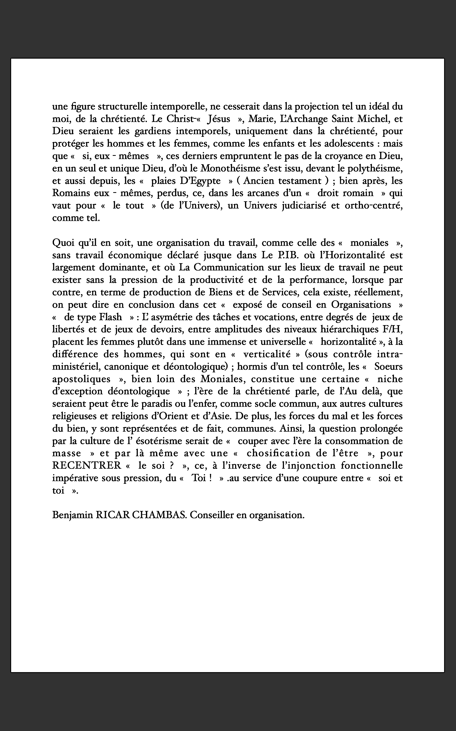 Comment une société peut elle avoir "un bien - être" dans le travail, dès lors que ce travail où les rotations sont puissantes, représente un "passage étroit" entre "l'erreur professionnelle" potentielle et "la rigueur professionnelle" probante ? L'étroitesse de cette "traversée" pour ces femmes qu'aurait elle à dire, à l'œuvre littéraire de Stephane Sweig "24 heures dans la vie d'une femme" ? Être chargé de la protection et d'information du droit des femmes, après un cursus de sociologie, représente un enjeu de taille dans une société trés imprégnée d'un Homo-Habitus-Inter-changeable, l'hommo-Economicus, pion de performance qui ne vit pas son métier, mais qui fait son Job.