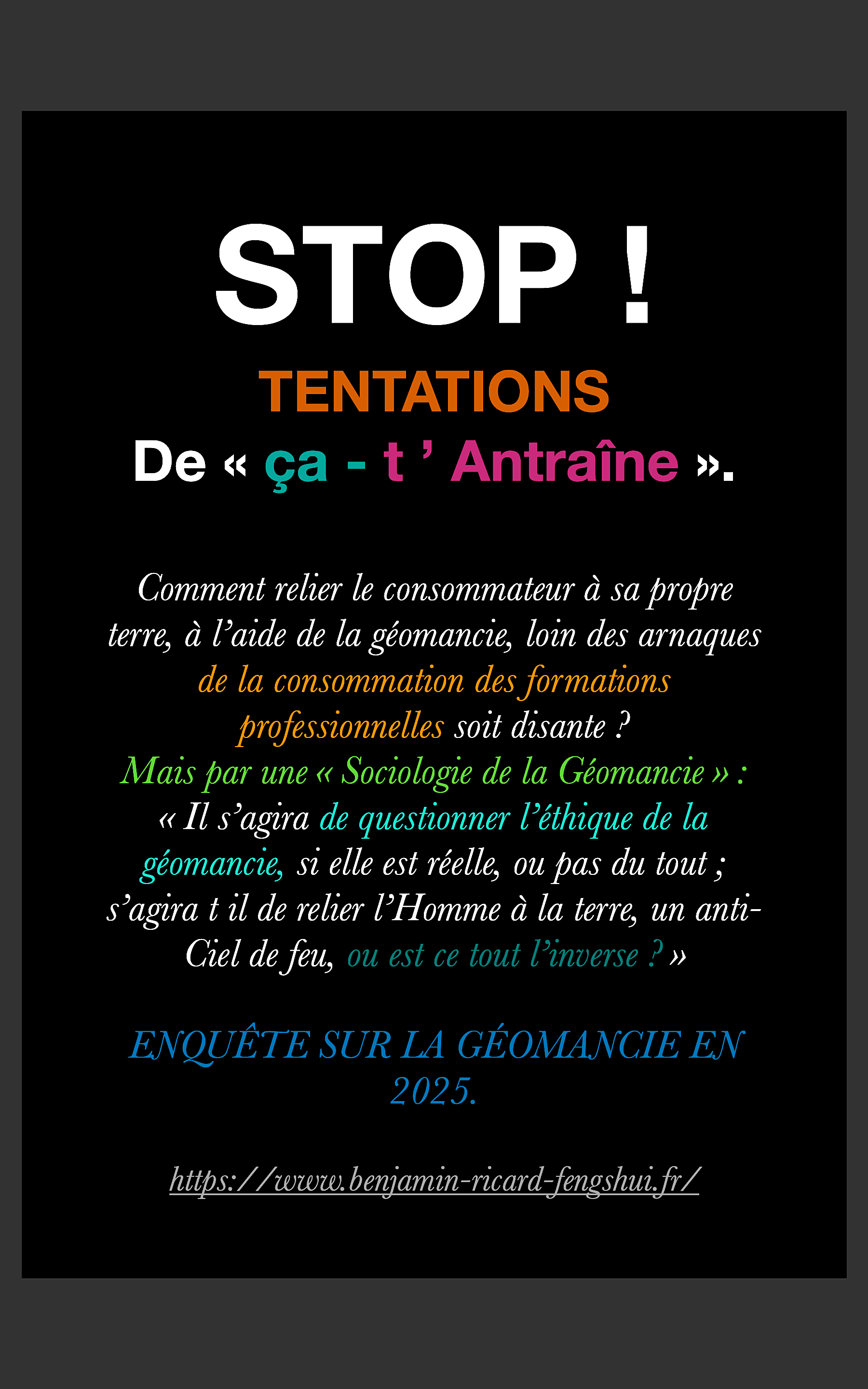 il s'agit juste de donner un aperçu par cette mini enquête de ce qu'il en est de nos lieux en société à notre époque lorsque ceux ci confèrent des critiques interrogeant ce que nous mobilisons en énergétique ( Feng Shui ), le ciel, et la terre ...