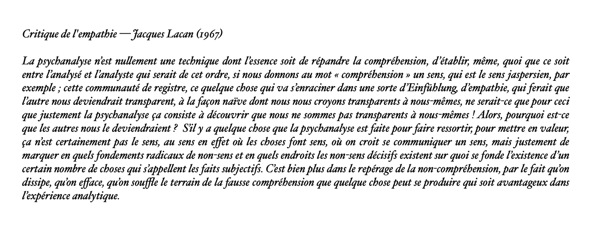Selon la psychanalyse lacanienne, c'est bien parce qu'on a un noyau en nous même qui échappe à sa lecture explicite de "faire sens" ( le logos ) qu'en fait, nous avons comme "un vide en SOI", tel que nous ne pouvons pas tout connaitre de nous même, si bien que c'est la même chose pour l'autre. Ce noyau de non sens, c'est le seuil de la subjectivité inviolable, qu'on ne peut toucher, programmer, re-programmer tels que les PNL devraient le savoir et je crois qu'elles le savent. D'ailleurs à présent, elles composent avec !