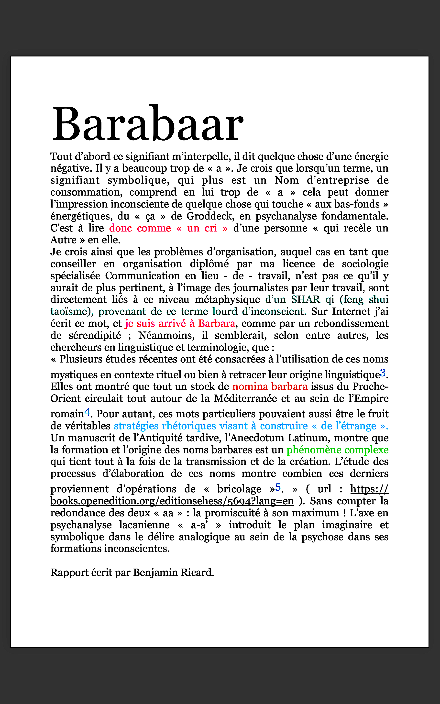 En effet on ne peut omettre le réel tel qu'il se formule dans le défilement des signifiants que l'on croise sans que nous soyons mobile, car bien au contraire, nous sommes statique. C'est la pression du Fantasme ( autre concept lacanien )qui vous fixe, qui nous fixe. Elle nous freine, nous ralentie, nous met dans le désordre par rapport à une réalité, souvent des plus matérielle, des plus castratrice justement : l'argent, en première ligne. Donc, si la pression du fantasme nous fige, et nous faire croire, nous illusionne d'un mouvement , nous avons tout à gagner à nous refuser d'une telle emprise. Je pense qu'il est trés difficile contrairement à ce que laisse présumer un tel repérage de s'en départir ... Nous cherchons continuellement un autre - un autre à un autre. D'autres conjoints, d'autres objets, qu'ils soient là, ou partiellement là, toujours un objet auquel se référer, duquel nous trouverions l'instrument symbolique à notre issue, à savoir nous assurer, nous garantir d'une identification par exemple socio-professionnelle qui inclurait, dans sa formule : un revenu, ou une rémunération, nous extrayant enfin une bonne fois pour toutes, de l'impasse financière, ce qui est louable mais illusion ... Je crains que le capitalisme des écoles nous permette de consommer des semblants dont nous ne voyons que l'instrument d'une issue. Je crois que la véritable issue que l'on pourrait aviser de se coltiner soit au niveau pulsionnel inconscient : à savoir, que le lien perdu à l'autre nous pousse dans la pulsion qu'elle soit symbolique notamment comme intellectuelle. Nous nous refusions à voir les choses en face, par la torpille du jeu du langage des mensongères requêtes adressées à l'Autre, plus exactement au "REGARD DE L'AUTRE ( le surmoi )".