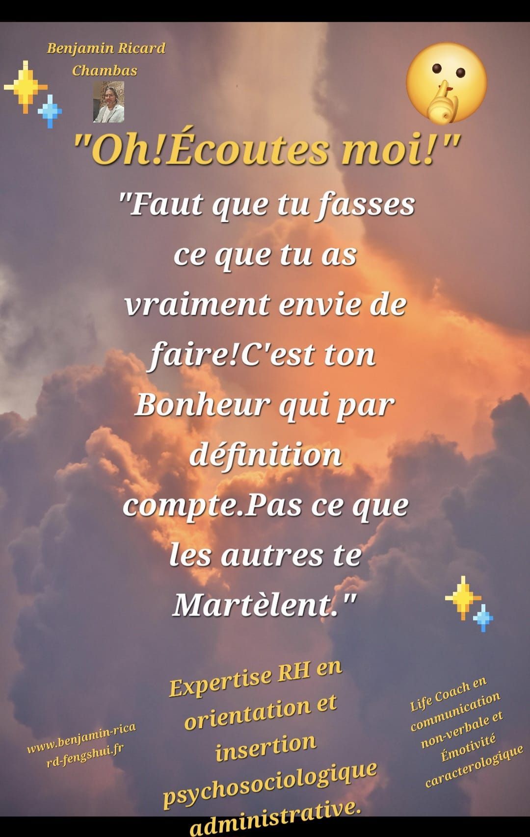 EN ATTENDANT, JE LUI PROPOSE DE PRENDRE DE LA DISTANCE DEVANT CE TEXTE ICI PRÉSENT ET NE PAS PRENDRE CELA COMME ARGENT COMPTANT, AU PIED DE LA LETTRE, MAIS COMME UNE INVITATION VERS UN "VOYAGE INTROSPECTIF INTÉRIEUR DÉDIÉ À UNE OPTIMISATION DE BIEN - ÊTRE".