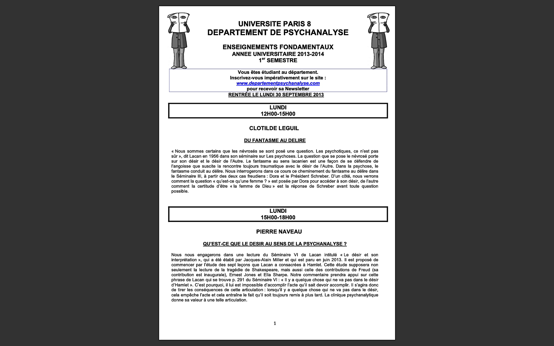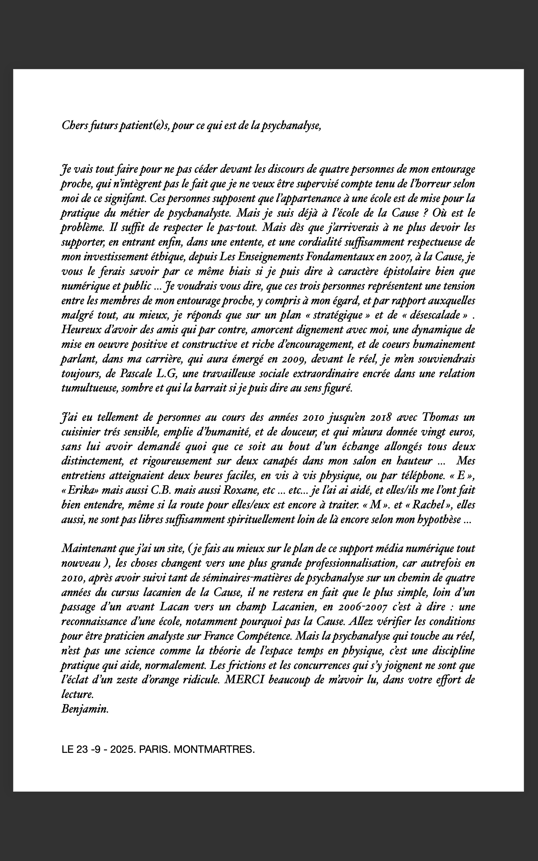 Je suis rattaché sur un plan épistémologique à l'e.c.f. l-école de la cause freudienne. ("l'école de la cause", "la cause", dit on dans le jargon ).