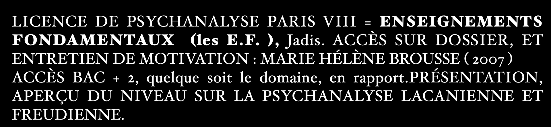Sachez que le cursus de psychanalyse lacanien intrinsèquement au Enseignements Fondamentaux ( prépa au master ) puis aux études du master de psychanalyse dans les années fin 2000, sont sous l'aile de l'ECF depuis le début, bien avant même les années 1990.