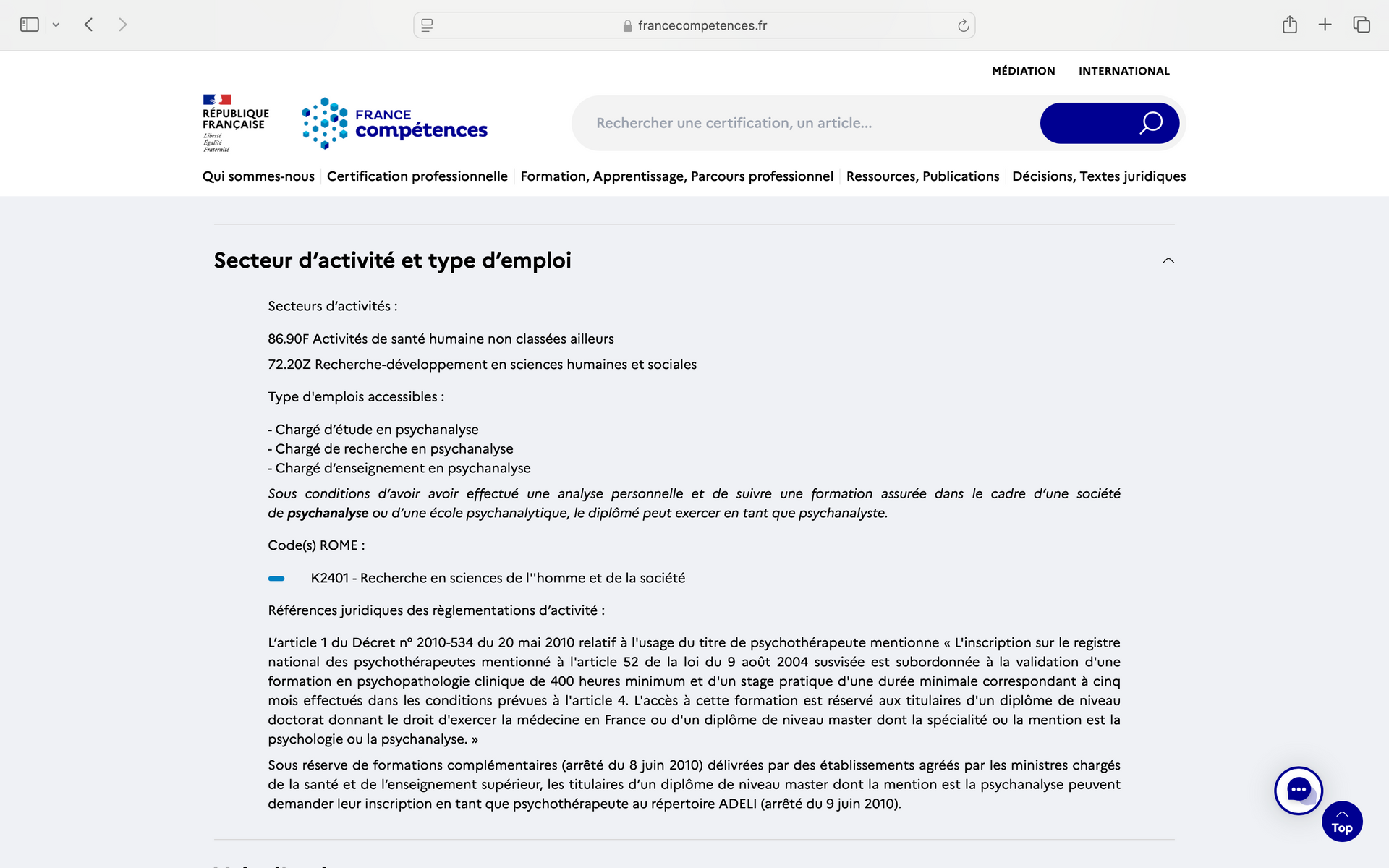 Voici un lien sur le site F.Compétence, concernant, L'objectivité professionnelle attribuée, au master psychanalyse comme tous master qui se respectent. Vers 2025, la fiche arrive je ne sais pourquoi, à échéance, étrangement. Mais voici, une capture d'écran. Sur ce qu'est ce master et sur ce qu'il était.