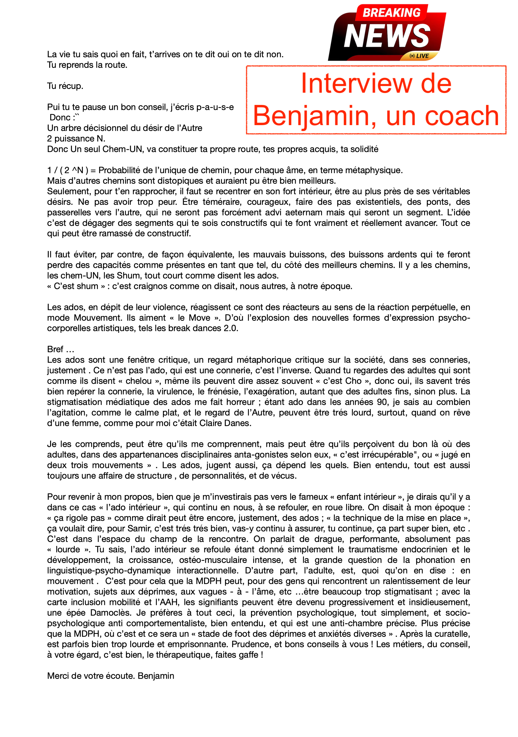 Vous ne vous rendez peut être pas compte encore de la position du secret professionnel, dans une société du langage de l'Autre. Là où bourdonnent nos oreilles à trop entendre partout des histoires, et des problèmes par dessus la tête, où tout fiche un peu le camp, dans une atmosphère pulsionnelle, d'interférence, de quiproquo, de fulgurances, de confusions, de choses obsessionnelles, etc ..